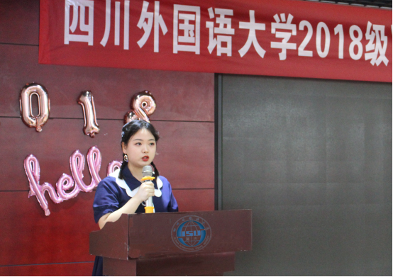 李依桐同学代表2018级国际组织人才实验班全体学生发言。李依桐用英语、西班牙语和汉语三种语言表达了国组班同学对辛勤育人的学校领导和老师的衷心感谢,以及对即将结束的川外校园生活的依依不舍。