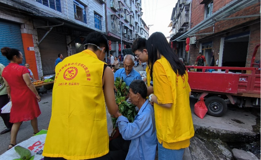 志愿者帮助老党员在集市卖菜,体验劳动