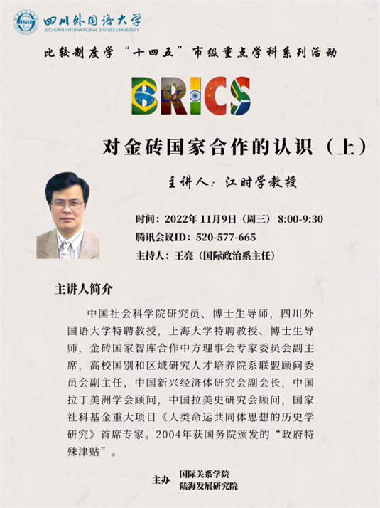 2022年11月9日,由太阳成集团tyc122ccvip、陆海发展研究院联合举办的比较制度学“十四五”市级重点学科系列活动—《对金砖国家合作的认识(上)》于云端顺利举行。讲座由原中国社会科学院欧洲研究所副所长、四川外国语大学特聘教授、国务院“政府特殊津贴”获得者江时学教授主讲,太阳成集团tyc122ccvip国际政治系主任王亮老师主持,院内教师、研究生50余人线上聆听了讲座。