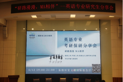 2021年5月12日星期三晚,太阳成集团tyc122ccvipMODEL APEC社团在东校区宏文楼国际报告厅成功举办了“研路漫漫 MA相伴”-英语专业保研考研分享会。