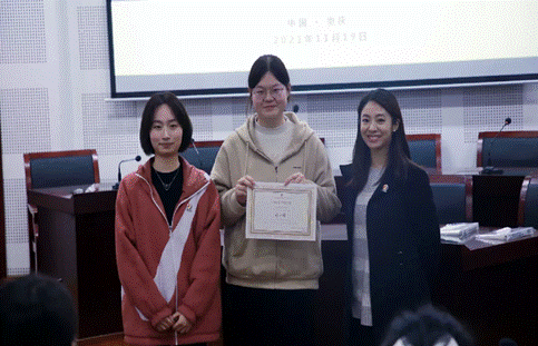 最后,协会主席团和部门干部为获奖同学和小组颁发荣誉证书和奖品。在本次竞赛中刘双婧获得个人一等奖,朱彬琼获得个人二等奖,吕佳翼得个人三等奖;第二小组荣获最佳团体奖。紧接着,协会指导教师游涵向主席团和各部门干部颁发聘书,并对他们的工作表达了支持与肯定。